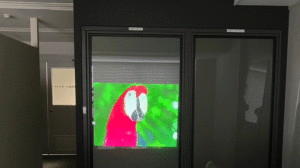 また、間に液晶が入っておりますので、プロジェクター投射すれば高精細な映像がお楽しみいただけます。その機能を活かし、イベントや見学通路などで、サプライズ演出としても御活用頂いております。
